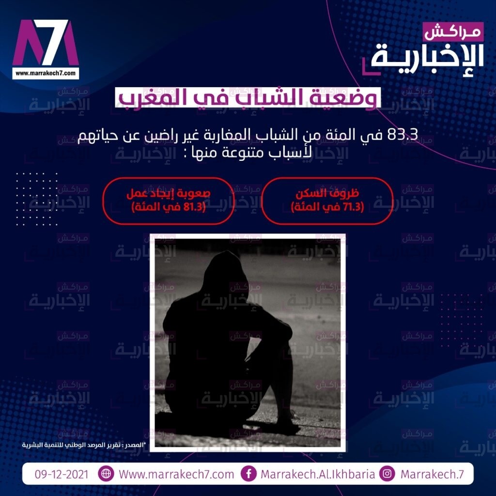 معطيات أخرى صادمة كشفها تقرير المرصد الوطني للتنمية البشرية حول وضعية الشباب في المغرب؛ إذ بيّن البحث الذي قام به المرصد أن 83.3 في المئة من الشباب المغاربة غير راضين عن حياتهم لأسباب متنوعة، منها ظروف السكن (71.3 في المئة)، وصعوبة إيجاد عمل (81.3 في المئة).