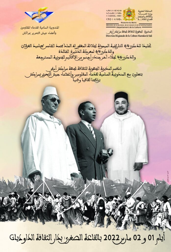 تخليدا للذكرى 64 لزيارة الوحدة التاريخية لجلالة الملك محمد الخامس لمحاميد الغزلان والذكرى 64 لمعركة الدشيرة الخالدة والذكرى 46 لجلاء أخر جندي أجنبي عن الأقاليم الجنوبية المسترجعة تنظم المديرية الجهوية للثقافة بجهة مراكش أسفي ومصالحها الخارجية بتعاون مع المندوبية الجهوية لقدماء المقاومين وأعضاء جيش التحرير بقلعة السراغنة برنامجا ثقافيا وذلك يومي الثلاثاء 1 و2 مارس 2022.
