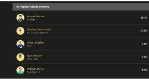 ووفقاً لآخر النتائج المؤقتة، يتصدر الحارس المغربي ياسين بونو القائمة بنسبة 38.7%، متقدما بفارق كبير على الإيطالي جيانلويجي دوناروما الذي حصل على 14.5%، فيما جاء الحارس الفرنسي لوكاس شوفالييه، المنضم حديثا إلى باريس سان جيرمان قادما من ليل، في المركز الثالث بـ 1.8%.