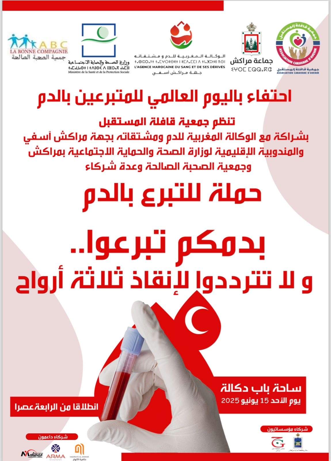 تنظم جمعية قافلة المستقبل، يوم الأحد 15 يونيو الجاري، حملة إنسانية متميزة بساحة باب دكالة بمدينة مراكش، تحت شعار “أرواح تنتظر منا نقطة دم… صدقة جارية لا تنضب”.