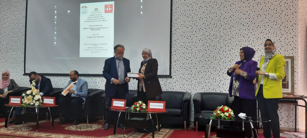 افتتح اللقاء بندوة قدمها السيد كارلوس بارونا ناربيون، مدير معهد ثيربانتيس بمراكش، حول “ الكلمات ذات الأصل العربي في اللغة الإسبانية. أهميتها في الحوار بين العالم العربي وإسبانيا مع بعض الأمثلة”، سيرتها الأستاذة الباحثة حليمة عدي، من جامعة القاضي عياض بمراكش.