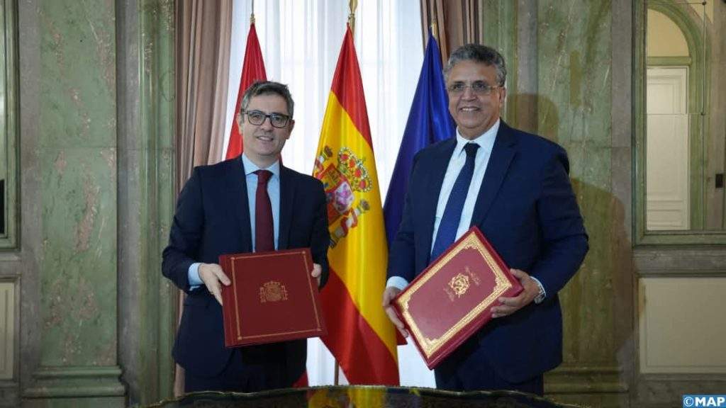 وقع وزير العدل، عبد اللطيف وهبي، ونظيره الإسباني، فيليكس بولانيوس، امس الثلاثاء بمدريد، على إعلان نوايا مشترك بين المغرب وإسبانيا في مجال العدالة، وذلك في إطار التحضيرات لتنظيم كأس العالم 2030.