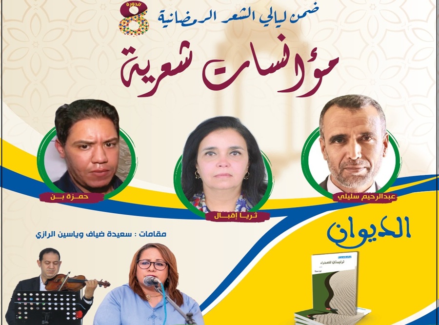 تنظم دار الشعر بمراكش، بتنسيق مع كلية العلوم القانونية والاقتصادية والاجتماعية بقلعة السراغنة يوم الثلاثاء 24 فبراير الجاري، فقرة جديدة من برنامجها “مؤانسات شعرية” ضمن افتتاح الدورة الثامنة لليالي الشعر الرمضانية، بمشاركة الشعراء عبد الرحيم سليلي وثريا إقبال وحمزة بن، فيما تشارك الفنانة سعيدة ضياف والفنان ياسين الرازي ضمن برنامج “مقامات روحانية”.