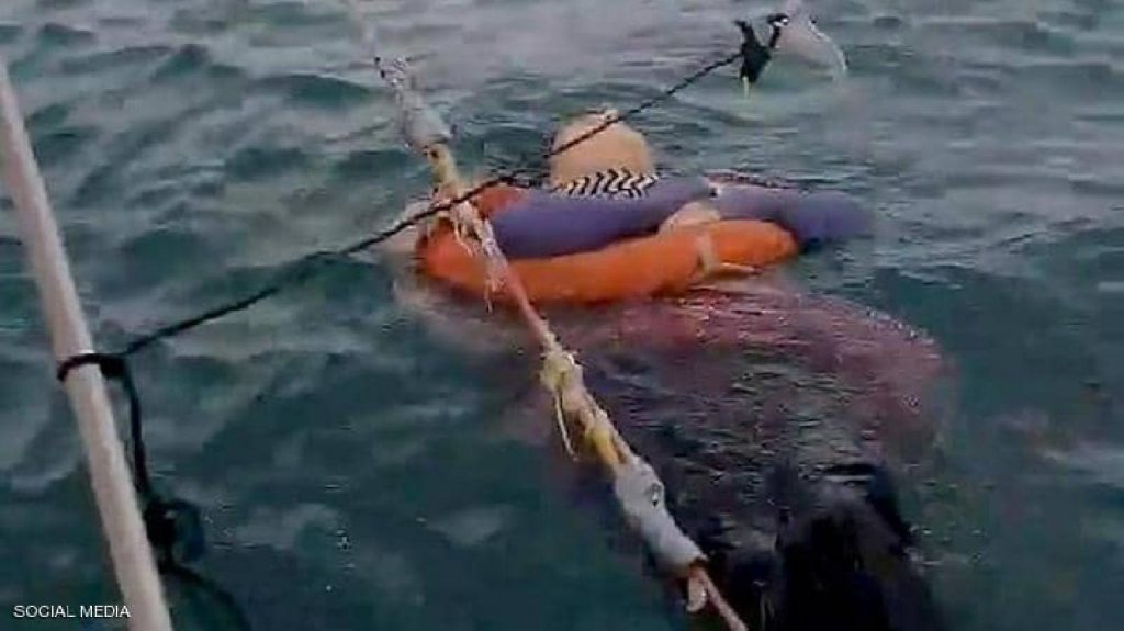 ووثق الصياد هذه اللحظة بمقطع فيديو فريد، يرصد ظهور المرأة حتى خروجها من البحر سالمة.