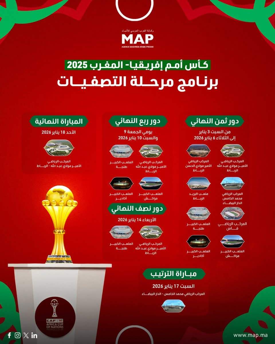 كشف الاتحاد الإفريقي لكرة القدم “الكاف”، أمس الجمعة، عن برنامج مباريات كأس أمم إفريقيا التي سيحتضنها المغرب خلال الفترة ما بين 21 دجنبر 2025 و 18 يناير 2026.