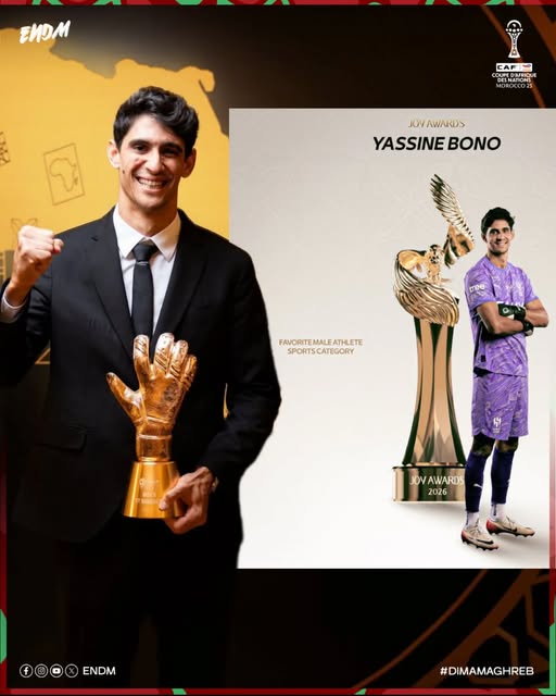 سجل الحارس الدولي المغربي ياسين بونو حضورا لافتا في واحدة من ابرز التظاهرات التكريمية بالمنطقة، بعد فوزه بجائزة جوي اواردز 2026 في فئة افضل رياضي، خلال الحفل الذي احتضنته العاصمة السعودية الرياض ضمن فعاليات موسم الرياض، وسط حضور وازن لنجوم الفن والرياضة والاعلام.